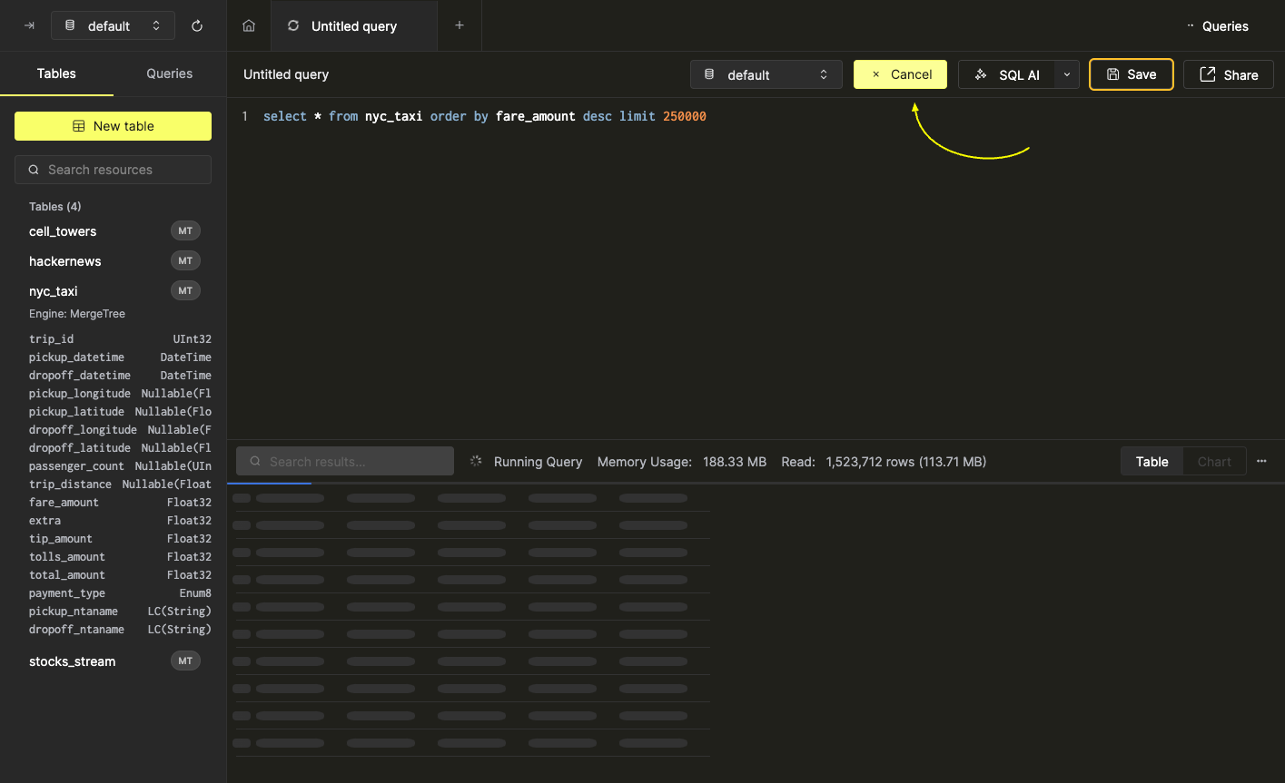An overview of tables contained in your ClickHouse instance can be found in the left sidebar area. Use the database selector at the top of the left bar to view the tables in a specific database