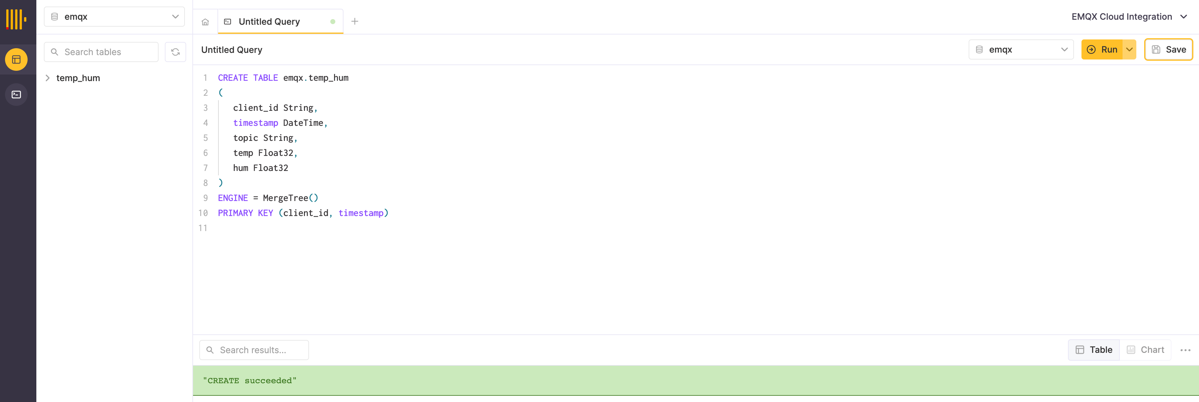 All the MQTT messages sent to the temp_hum/emqx topic will be persisted into your ClickHouse Cloud database.